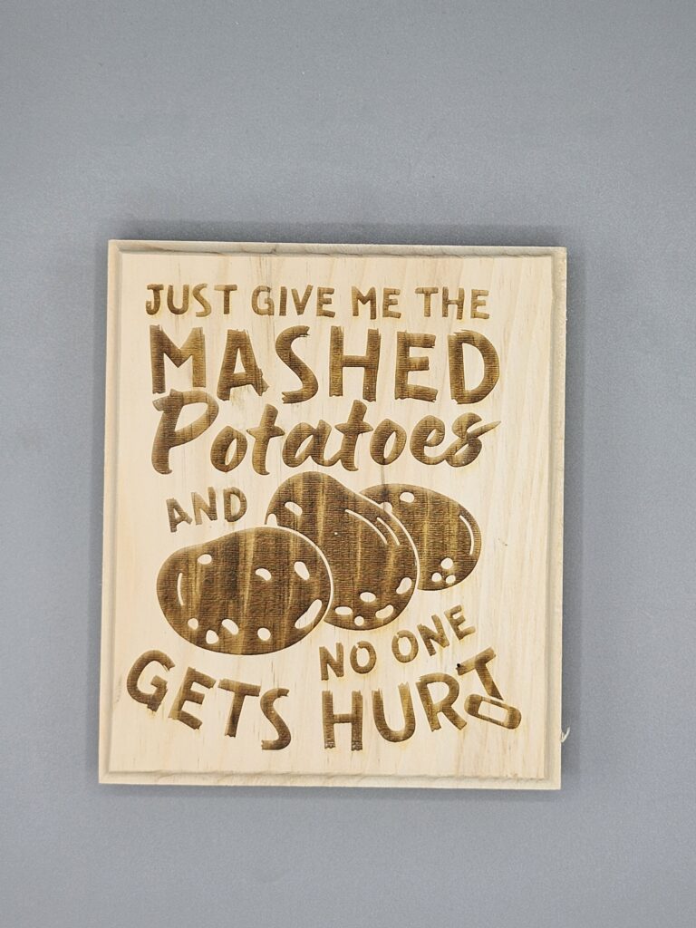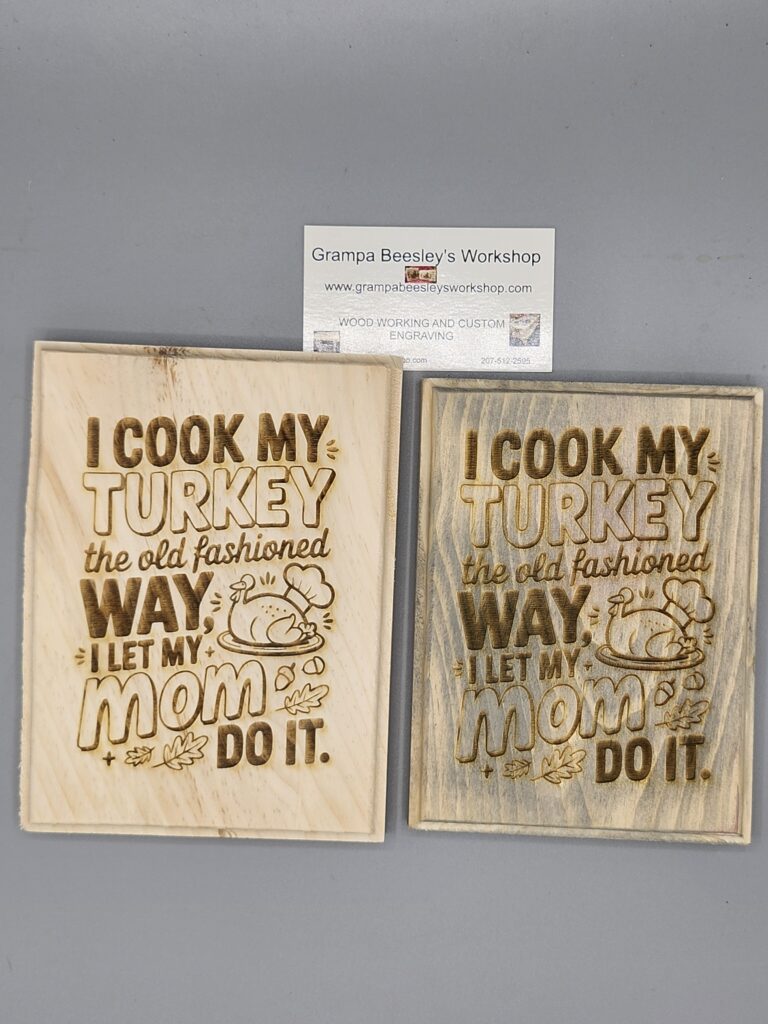 These wonderful sign prices vary on size and wood type. The $5 are usually a desk plaque, they stand up on a desk or shelf. The $10 signs are larger and have a picture hook on back if hanging able. Then the $15 are even larger with a picture hook when hangable. Live edge slab wood does not have hanging hooks and are usually self standing made of Maine pine.